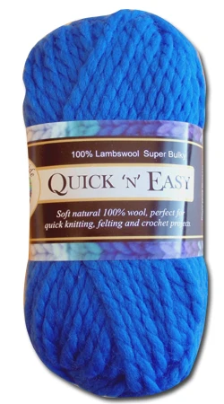Quick ‘N’ Easy is just that; using 10 mm needles this beautiful pure lambswool Super Bulky yarn will grow into a project in front of your eyes. The yarn is super soft and super warm have fun with Quick ‘N’ Easy.View our patterns for ideas or create your own – garments; slippers; hats; cushions or throws; can also be used for felting.